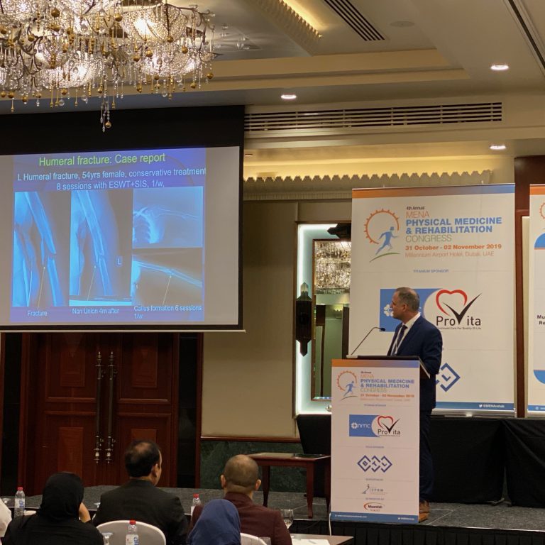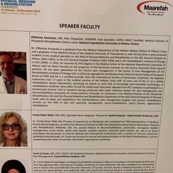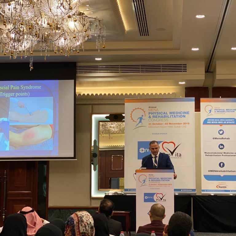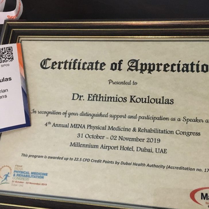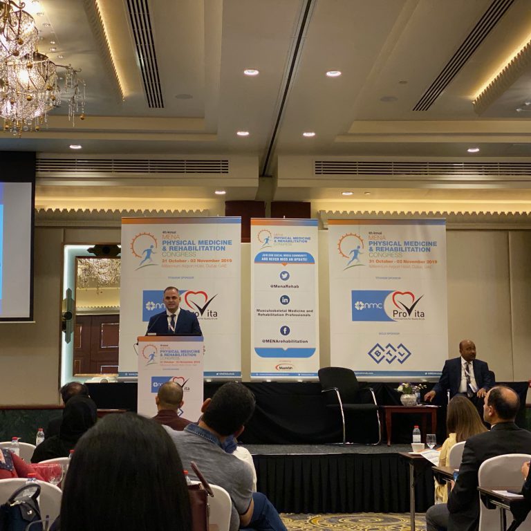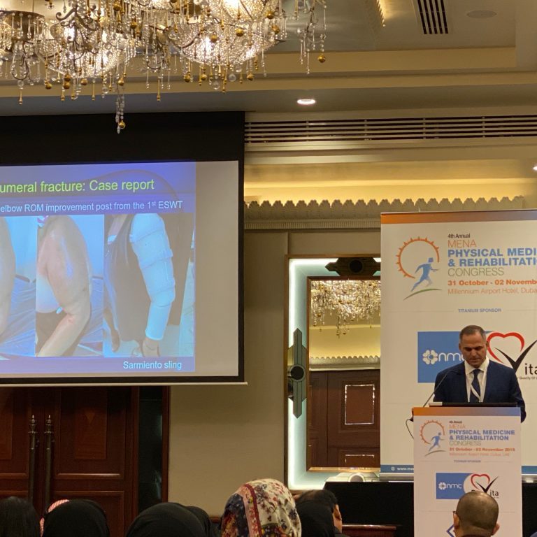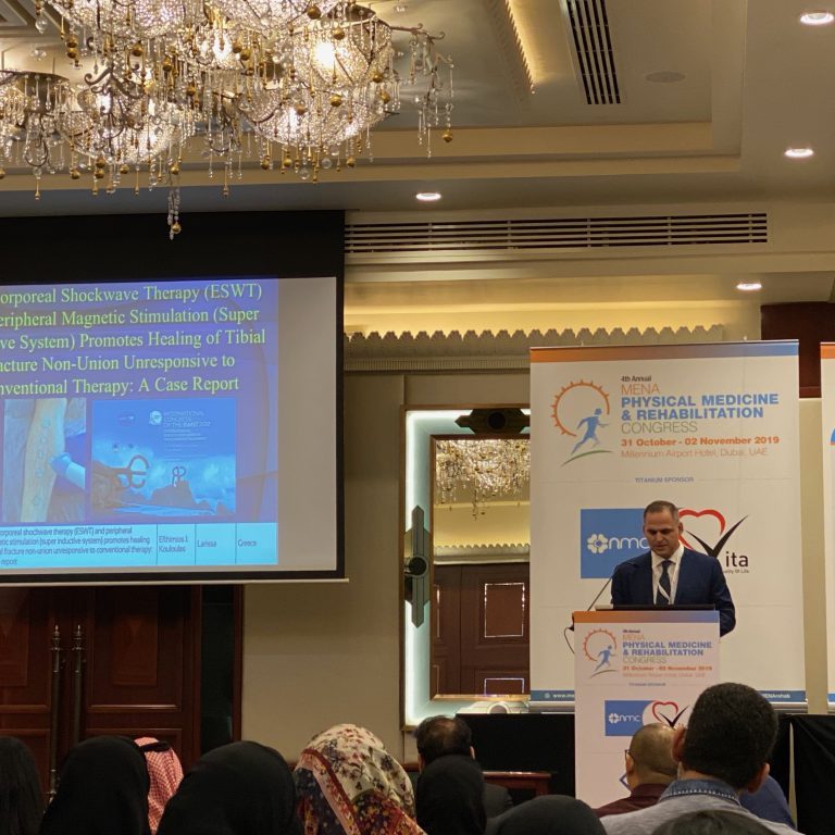 Με επιτυχία στέφθηκε η συμμετοχή για 2η συνεχόμενη φορά ως προσκεκλημένου ομιλητή του Επιστημονικού μας Διευθυντή Dr Ευθυμίου Κουλούλα στο 4ο Ετήσιο Συνέδριο Φυσικής Ιατρικής και Αποκατάστασης Μέσης Ανατολής και Βόρειας Αφρικής που διεξήχθει στο Dubai των ΗΑΕ, με θέμα εισήγησης «Αναγεννητική Ιατρική Αποκατάσταση στις μυοσκελετικές κακώσεις». Σε μία κατάμεστη αίθουσα παρουσιάστηκαν καινοτόμες εφαρμογές της Αναγεννητικής Ιατρικής Αποκατάστασης και τα αποτελέσματά τους, τεχνικές που εφαρμόζονται τα τελευταία έτη στους ασθενείς της Μονάδας μας. Το μεγάλο ενδιαφέρον επιβεβαιώθηκε με τις πολλές ερωτήσεις που ακολούθησαν της εισηγήσεως και την υψηλή βαθμολογία αξιολόγησης της παρουσίασης.