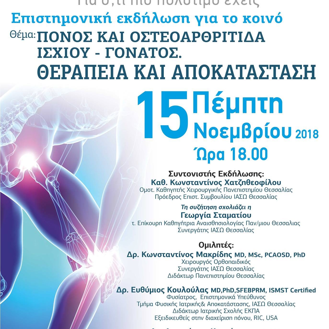 Επιστημονική ομιλία πολύ χρήσιμη για το κοινό πραγματοποιήθηκε στη Δημόσια Κεντρική Βιβλιοθήκη της Λάρισας την Πέμπτη 15 Νοεμβρίου με τίτλο «ΠΟΝΟΣ & ΟΣΤΕΟΑΡΘΡΙΤΙΔΑ ΙΣΧΙΟΥ – ΓΟΝΑΤΟΣ. ΘΕΡΑΠΕΙΑ & ΑΠΟΚΑΤΑΣΤΑΣΗ».